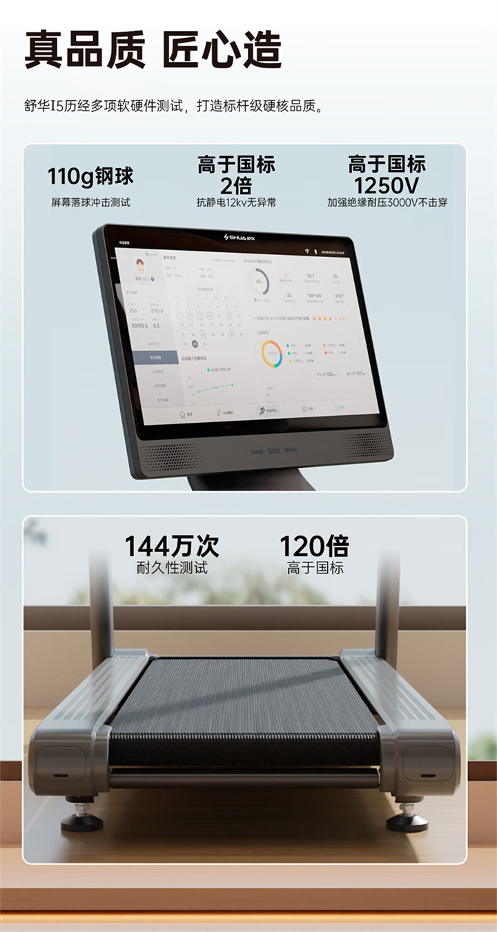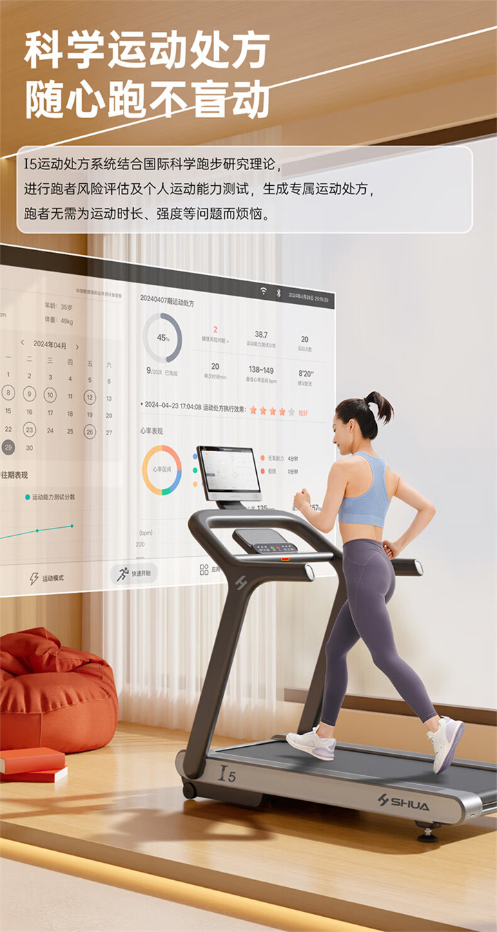 舒华I5智能家用跑步机是由舒华体育联合中国体育科学学会、上海体育大学运动科学学院教授陆大江等权威机构、专家共同研发设计。独特之处在于它结合国际科学跑步研究理论,能够针对不同用户进行运动能力测试,并根据测试结果生成因人而异的有氧运动处方。这意味着每个用户都能得到一个适合自己的运动方案,从而更好地达到运动效果。这一创新技术可以确保用户在运动过程中能够保持在最佳的区间状态,从而提高运动安全性和有效性。