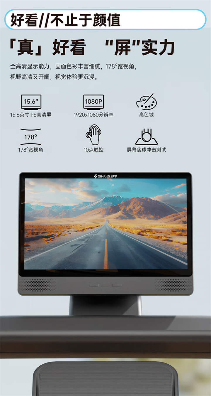 锐强体育推荐健身器材-舒华商用电动跑步机SH-T6500拥有10.1寸IPS高清触摸屏、Z型动感时尚外观设计、70×150mm精钢立柱机身、F级高效静音马达、520mm商用豪华跑带和35mm双层全跑台减震跑板等优势,让您享受科学跑步。